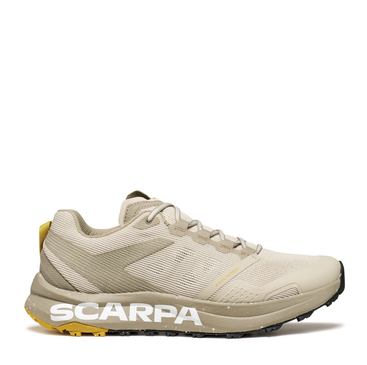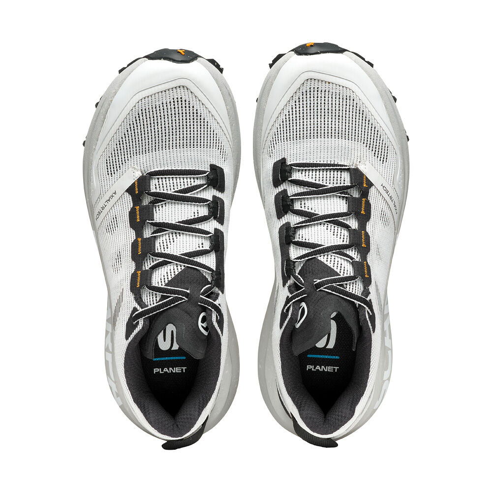 Следващата стъпка в пътуването на Scarpa за устойчиво развитие, SPIN PLANET въвежда нова концепция в категорията Trail Running с горната си част, която е изработена от 100% рециклирани материали, докато EVA междинната подметка е 45% рециклирана, а гумената външна подметка е 30% рециклирана. Идеалните обувки за бегачи, които преследват дълги разстояния по трейл пътеките, благодарение на обема на междинната подметка, предназначен да абсорбира ударите със земята и да осигури защитно омекотяване.