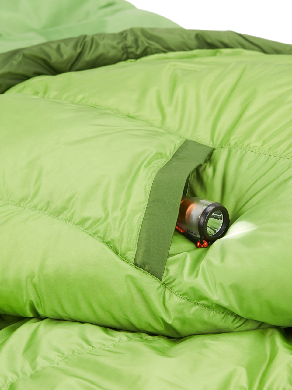 - Свръхлек спален чувал от сертифициран гъши пух, с екологично водоотблъскващо покритие ExpeDRY, което увеличава производителността и издръжливостта с намалено време за сушене